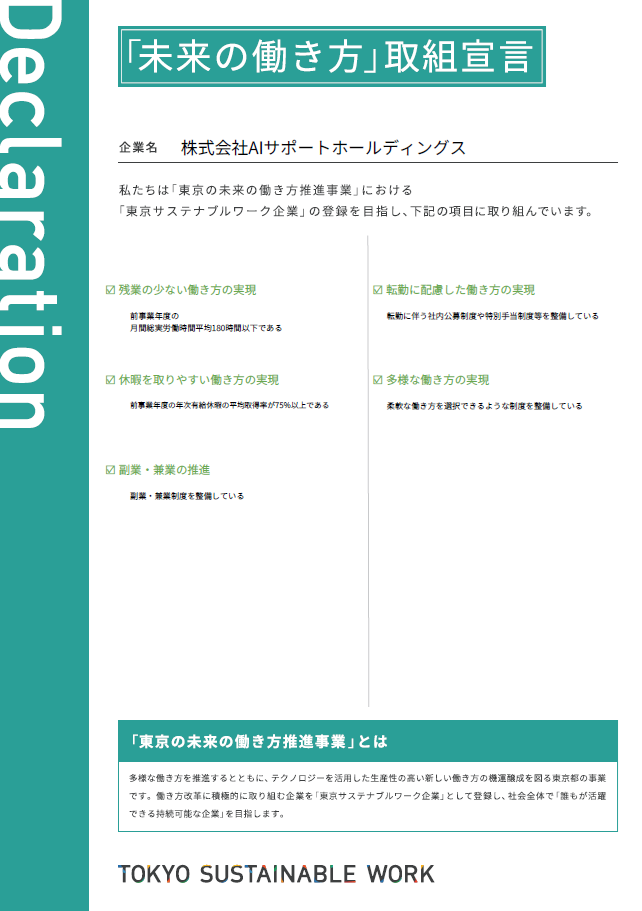 株式会社AIサポートホールディングス(所在地:東京都豊島区、代表取締役:山口 雄大)は、東京都が推進する「東京の未来の働き方推進事業」における「東京サステナブルワーク企業」の登録を目指し、「未来の働き方」への積極的な取り組みを宣言します。